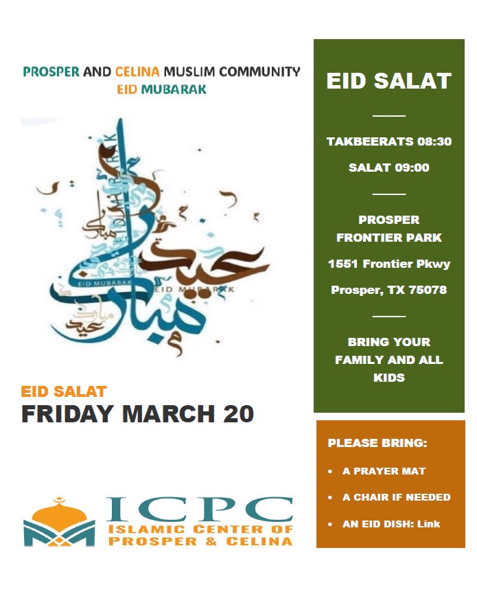 Eid Al Fitr Prayer Friday, March 20th 8:30 AM (Takbeerat Start) 9:00 AM (Salah -Eid Prayer) Pavilion at Prosper Frontier Park (1551 Frontier Pkwy Prosper TX 75078) *Jumma Prayer* at Islamic Center of Prosper (861 N Coleman St # 190, Prosper, TX, 75078) Khutba:1:45 pm, *Jummar Prayer* at Islamic Center of West Celina (2616 S Legacy Dr, Celina, 75009) Khutba:2:15 pm
